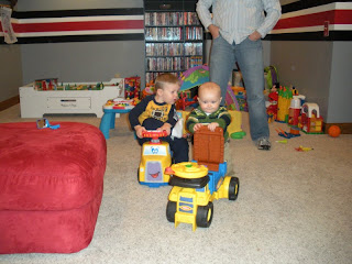 After I got home from work today, we got ready and picked up some Papa John's pizza and headed over to Tom and Sheila's to hang out. Ethan had so much fun playing with Mason and checking out his toys!! Lots of ideas :) The boys did really good together, and Mason was so nice to share with Ethan. They had fun cruising around together and 'racing' with Mason's push toys! Ethan crashed as soon as we got in the car.